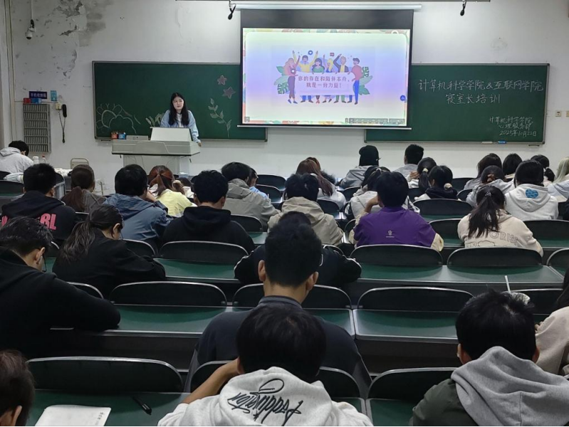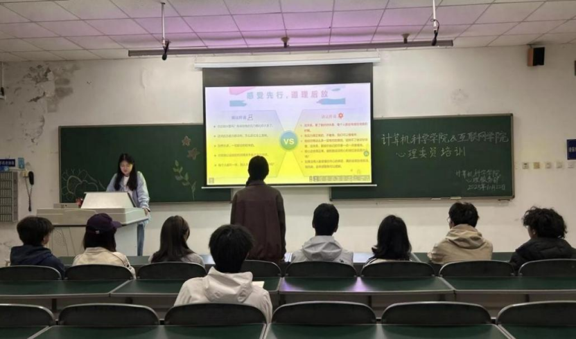 计算机科学学院心理服务部于 2025 年 10 月 22 日在第一教学楼 A114 开展2025级新生寝室长与心理委员专题培训会,两场培训会均由学院心理助管唐露瑶担任主讲。