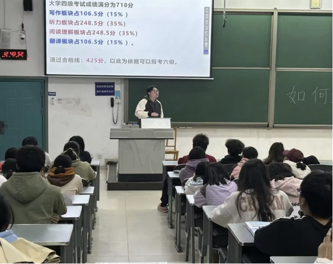 2025年11月16日,学院在四川师范大学成龙校区第一教学楼C102举办了四六级考试指导讲座。本次活动由新东方讲师孟老师主讲,2025级学生吴思琪主持。