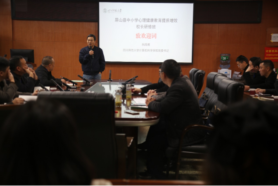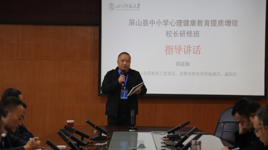 邱延彬代表屏山县委教育工委做指导讲话。他要求各位学员在本次研修中要实现三个目标:一是认识有提高。他要求大家通过本次培训对教育的理解有提高,对心理健康工作在学校各项工作中的重要性的认识有提高。二是思路有拓展。他要求大家在专家的引领下反思按惯例开展心理健康工作出现的思维固化,在今后的工作思路上有拓展。三是凡事有行动。他要求大家对研修成果进行深度应用,按照规定要求把培训成果落实到具体的工作中去,实现学校心理健康教育工作提质增效。